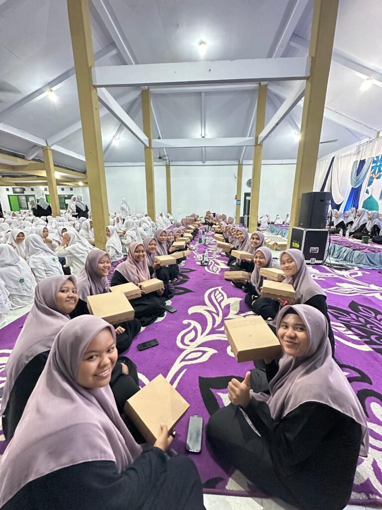 Sementara itu, santri putri melaksanakan pembacaan Maulid Dibaiyah di Aula 1 dan 2 Pondok Putri. Suasana berlangsung khidmat dan penuh haru, seakan-akan kehadiran Rasulullah benar terasa. Kemeriahan acara semakin bertambah dengan kegiatan “Tukar Kotak Misteri”. Dalam kegiatan ini, pengurus menyediakan kotak kosong untuk diisi oleh para santri dengan berbagai barang, minimal senilai Rp15.000. Dengan penuh antusias, santri berlomba-lomba mengisinya dengan berbagai isi, mulai dari makanan, perlengkapan mandi, Al-Qur’an, buku doa, tasbih, dan lainnya. Tidak hanya santri yang ikut serta, para pengurus dan ustadzah pun ambil bagian.Â